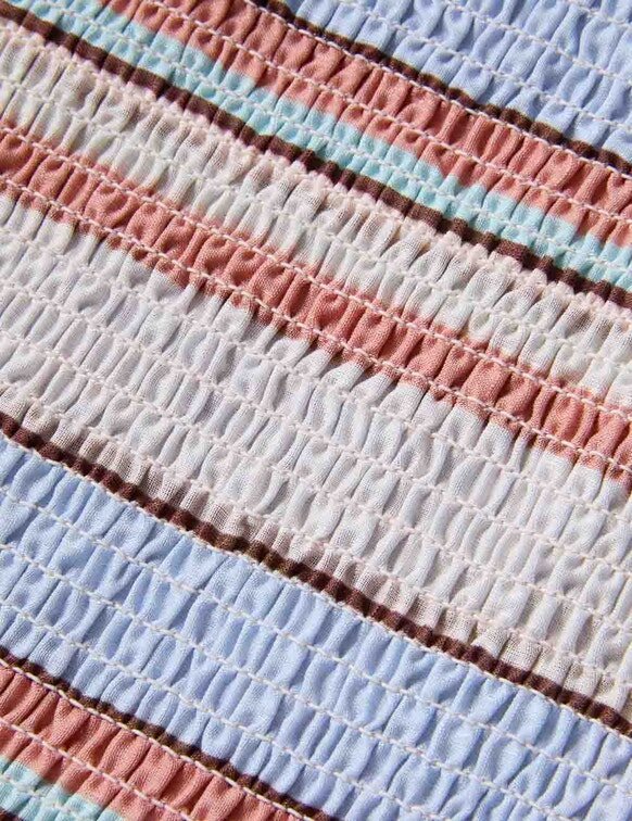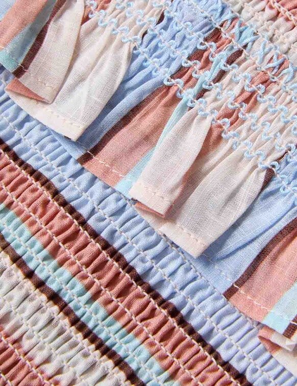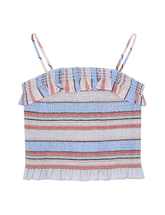 The Daylight Kids Shirred Top in Multi Stripe from Our Resort Swim 2026 Collection. A Kids Cotton Top Featuring a Frill Neckline and Shirring Throughout.