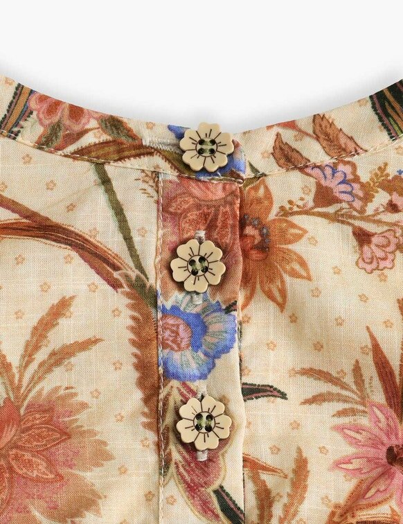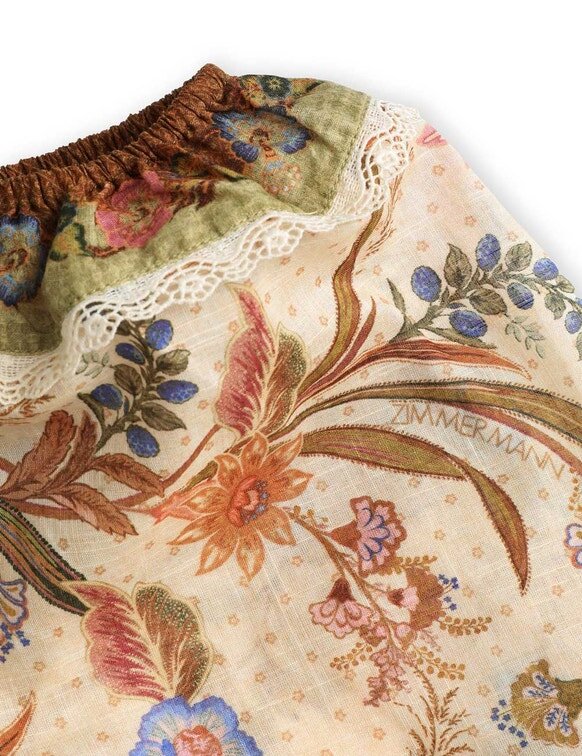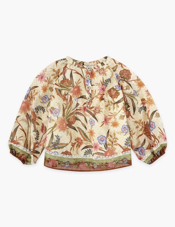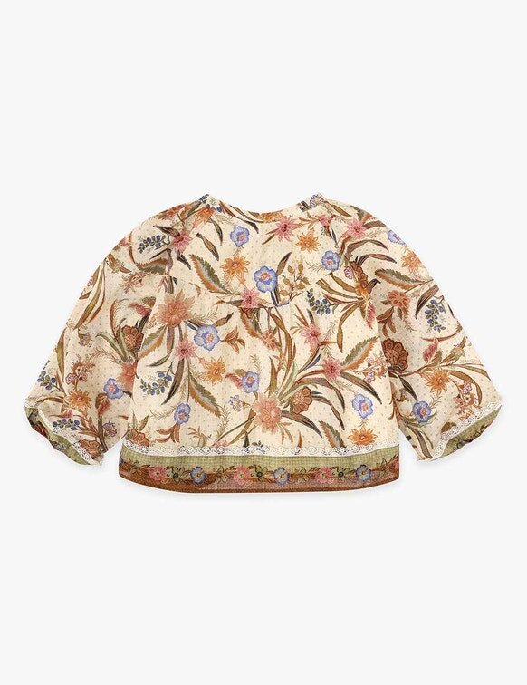 The Indra Kids Trim Contrast Top in Cream Khaki Scarf Floral from Our Summer Swim 2026 Collection. A Cotton Kids Top Featuring a Rounded Neckline, Long Billow Sleeves, Centre Front Buttons and Lace Trim Throughout.