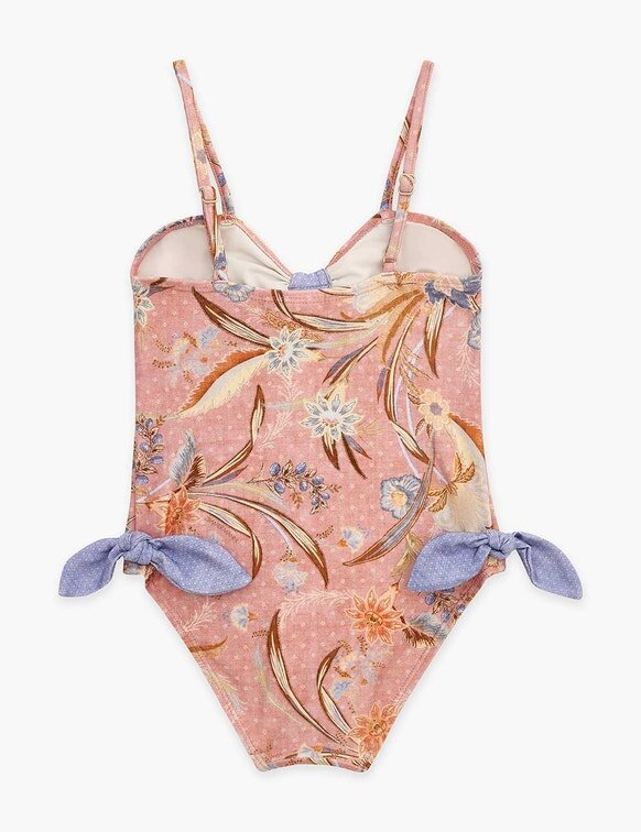 The Indra Kids Tie Front 1Pc in Pink Scarf Floral from Our Summer Swim 2026 Collection. A Kids One Piece Featuring a Sweetheart Neckline Featuring Bow Detail at Bust and on Hips.