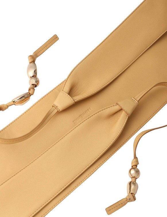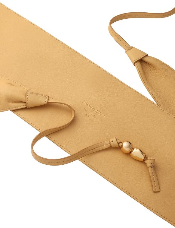 The Foam Pebbles Wrap Belt 120 in Sand from Our Spring 2026 Collection, Kindred Spirit. A Wide Leather Belt Featuring a Self-Tie Knot Detailing at the Centre Front with Gold Beaded Trim.