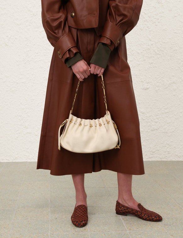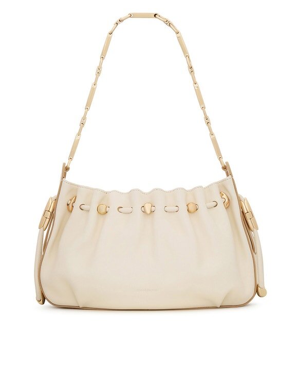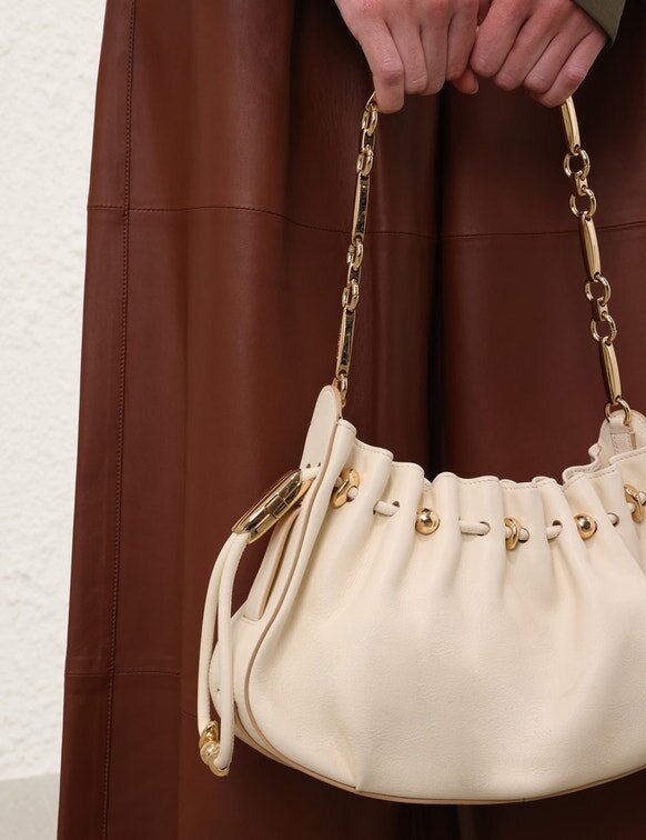 The Ultimate in Day-To-Night Dressing, the Halcyon Clutch is Defined by Its Ruched Silhouette, Complemented by Decorative Gold Beads That Evoke Pebbles Collected on the Shore. Crafted from Soft Calfskin Leather, the Clutch Features a Bespoke Surfboard-Inspired Gold Chain, Highlighting the Elegant Fusion of the Australian Surfing Culture and European Equestrian Style.