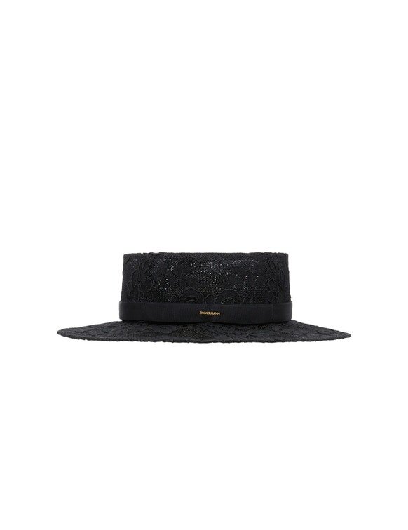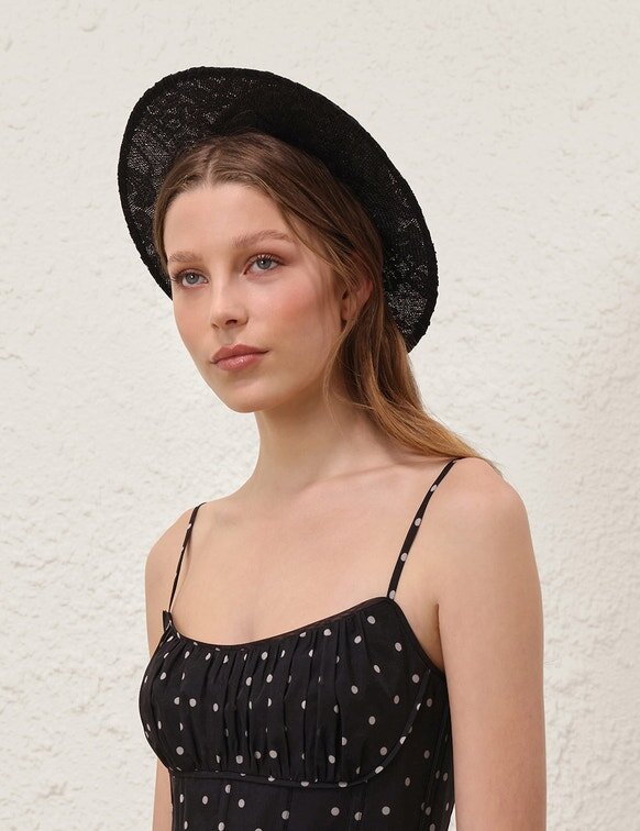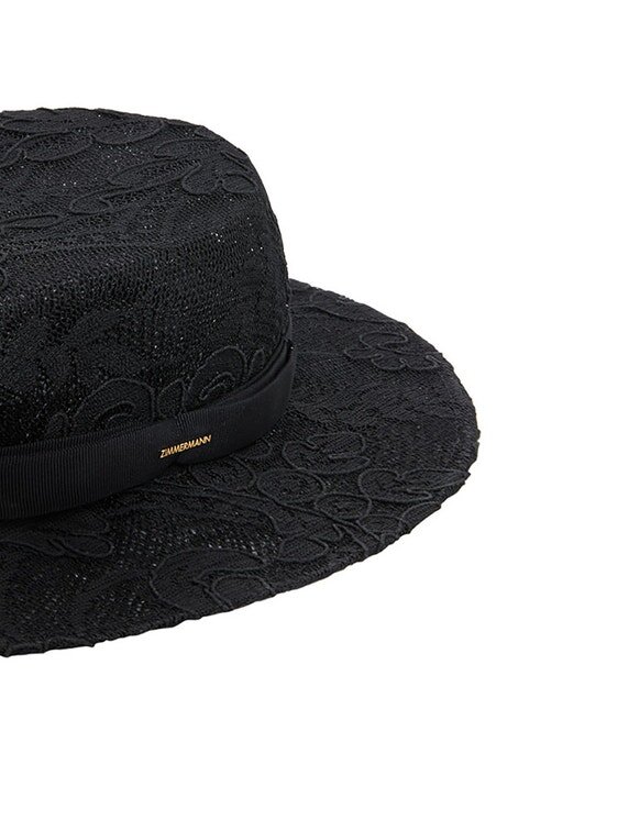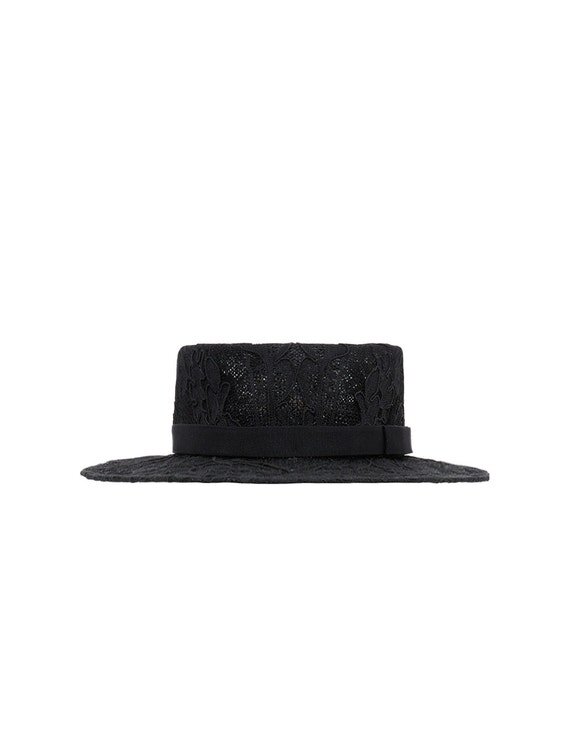 The Lace Boater in Black from Our Resort 2025 Collection, Crush. A Wide Brim Lace Hat Featuring a Fixed Bow Detailing at the Crown.