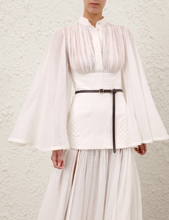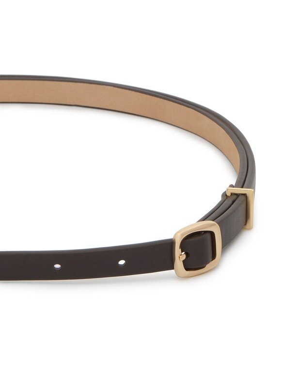 The Malley Belt 12 in Coffee from Our Cruise 2026 Collection, Twisted Romance. A Skinny Leather Belt Featuring a Statement Gold Hardware at the Centre Front.