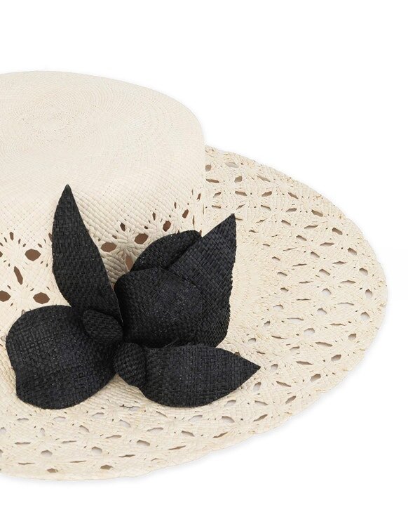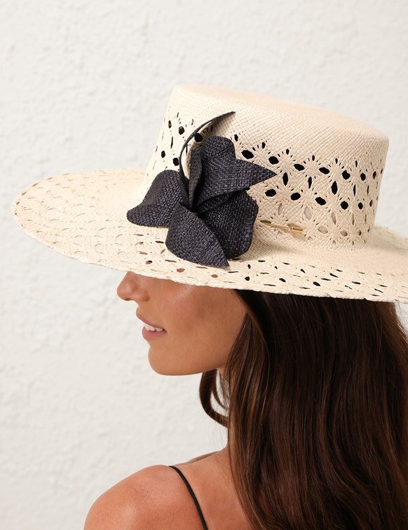The Orchid Boater in Natural/Black from Our Spring 2025 Collection, Illumination. A Wide Brim Straw Hat Featuring a Fixed Orchid Detailing at the Crown.