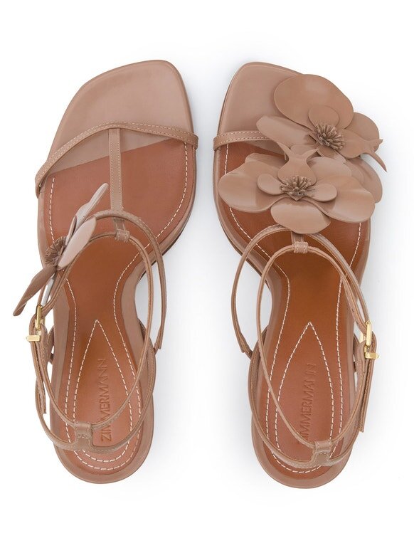 The Orchid Sandal 85 in Biscuit from Our Cruise 2026 Collection, Twisted Romance. A Heeled Sandal Featuring an Asymmetric Orchid Flower Design and Gold Buckle Hardware.