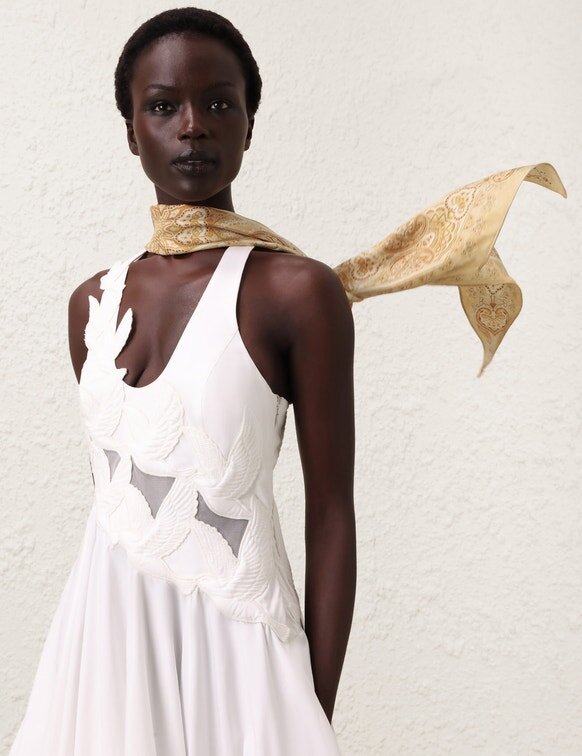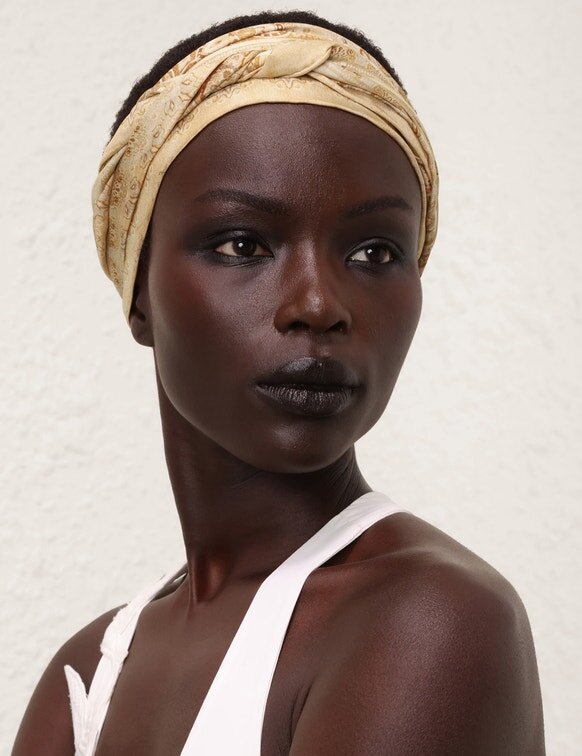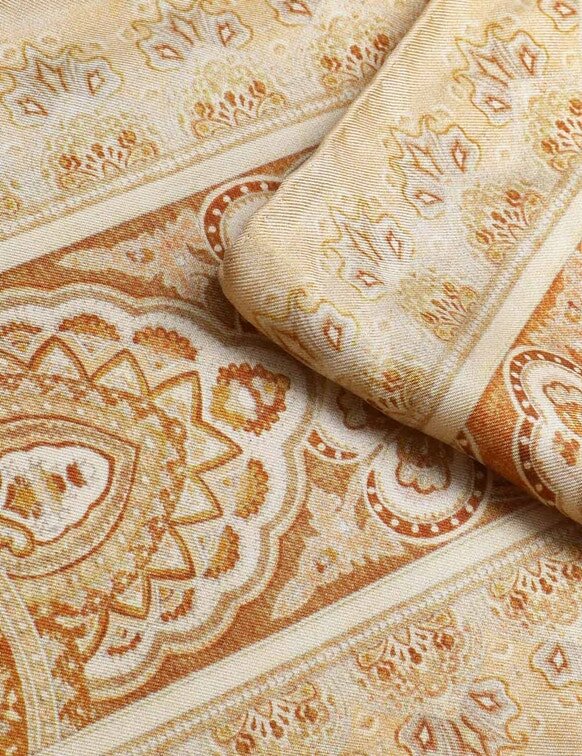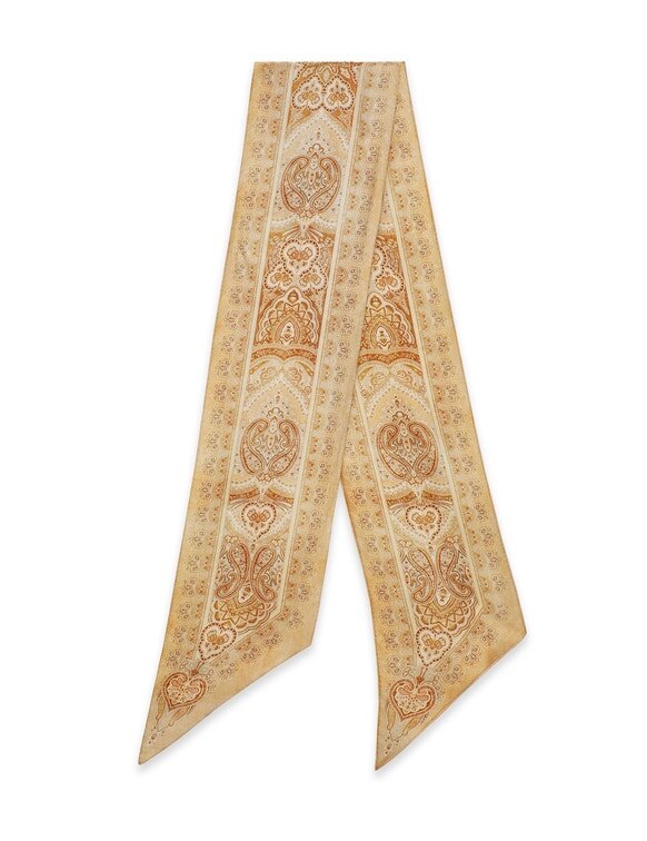 The Printed Silk Neck Scarf in Tan Perla Paisley from Our Spring 2026 Collection, Kindred Spirit. A Silk Neck Scarf Featuring a Customised Placement Print and Fine Rolled Hem.