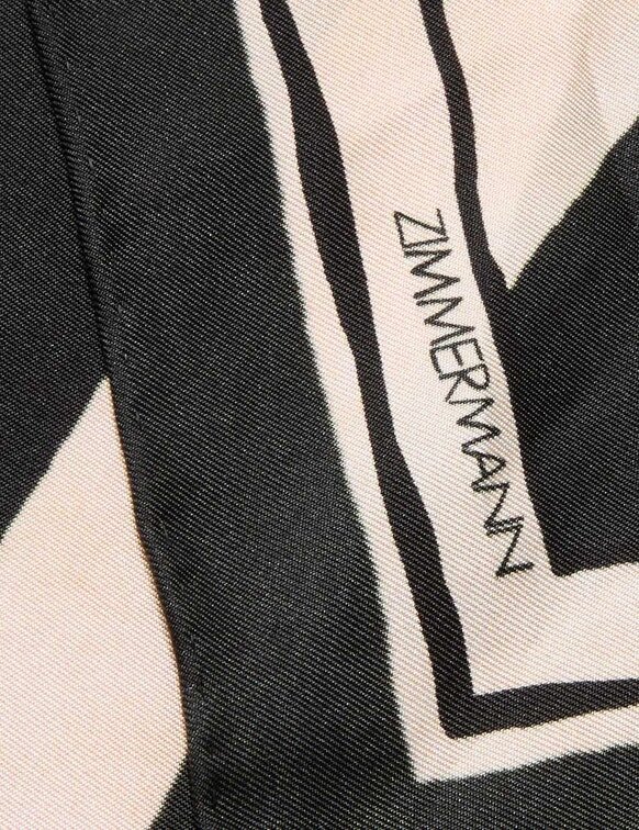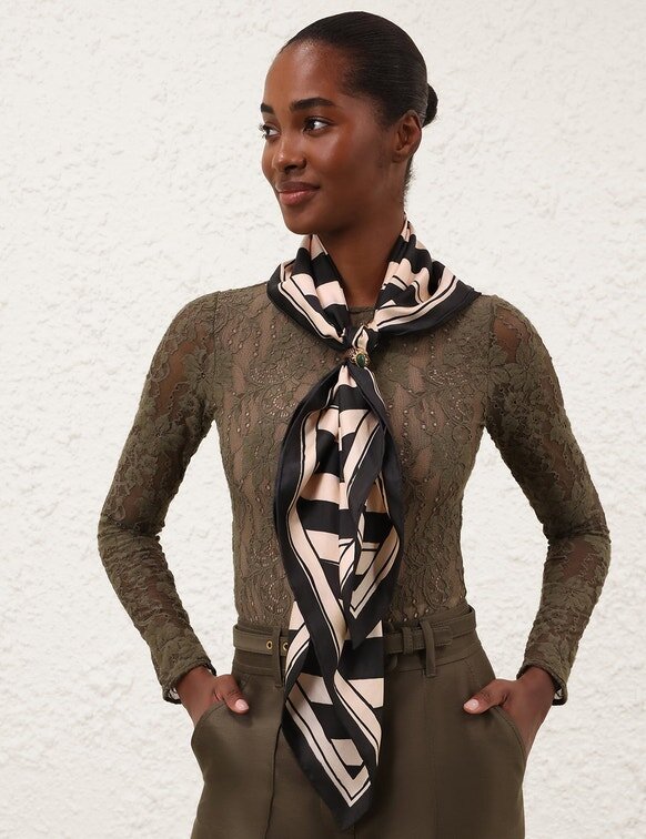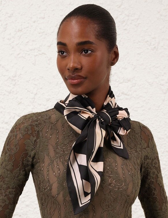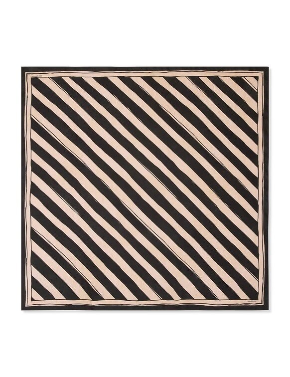 The Printed Silk Square 90 in Black Stripe from Our Cruise 2026 Collection, Twisted Romance. A Silk Square Scarf Featuring a Customised Placement Print and Fine Rolled Hem.