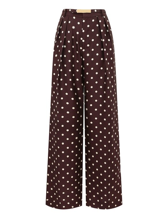 The Dot Straight Pant in Chocolate Dot from Our Spring 2026 Collection, Kindred Spirit. A Silk Pant Featuring a Mid-Rise Waistband with Belt Loops, Centre Front Hook and Bar Closure and a Wide Flare Hem.