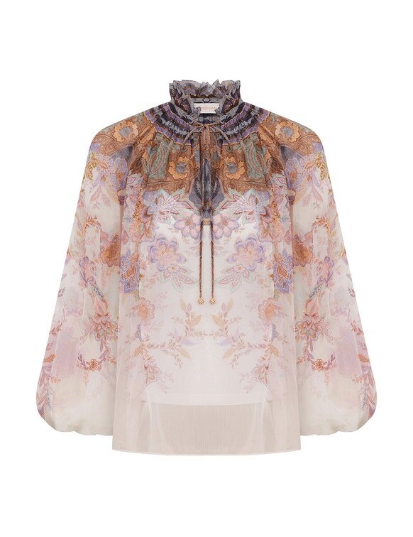 The Luna Billow Blouse in Cream Blue Paisley from Our Spring 2026 Collection, Kindred Spirit. A Blouse Featuring a Deep V-Neckline, Frilled Stand Collar with Rouleau Tie, Long Billow Sleeves, Finished with Elasticated Cuffs and Heavy Gathering Throughout.
