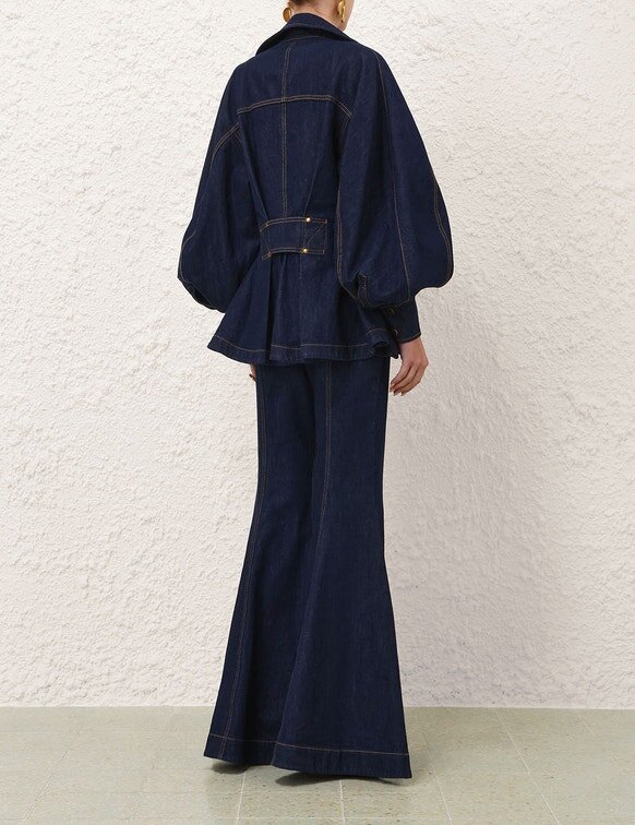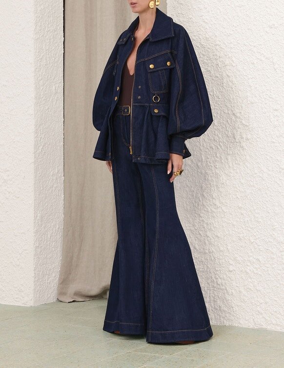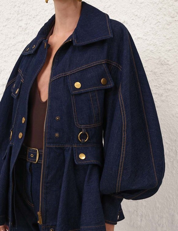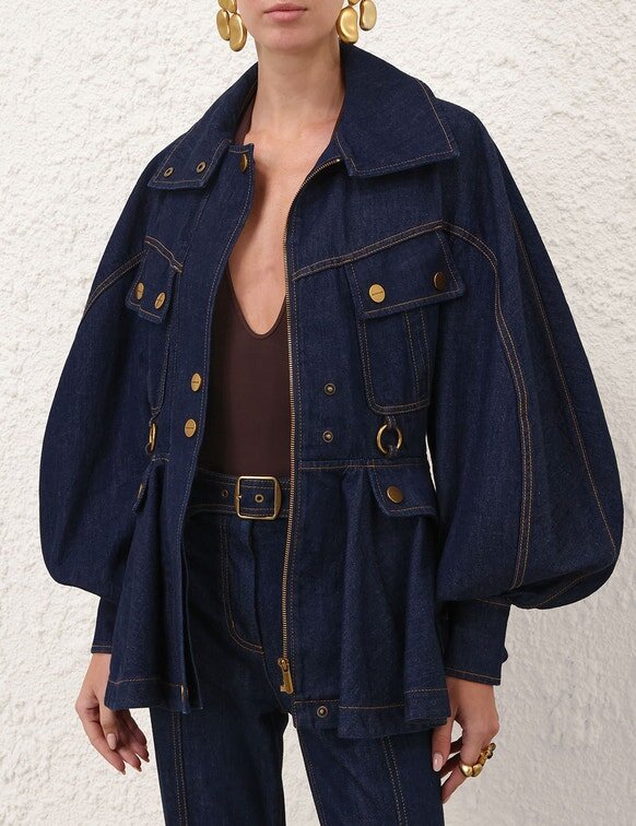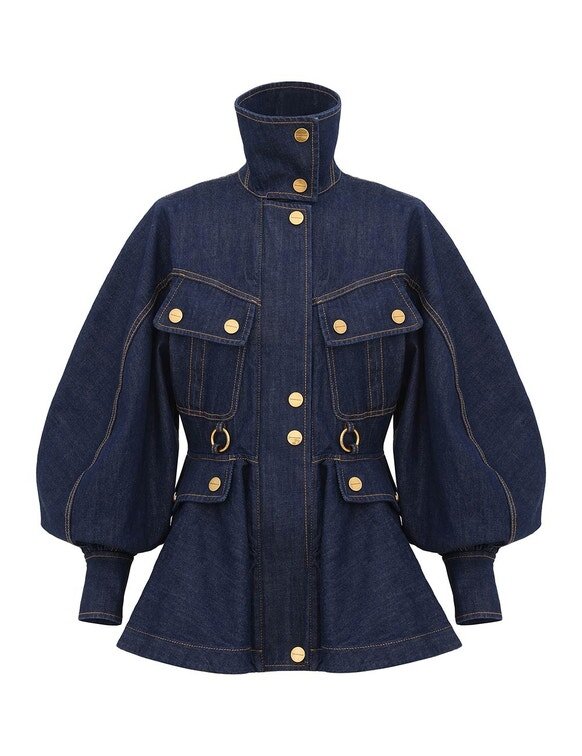 The Luna Drill Utility Jacket in Harbour Blue from Our Spring 2026 Collection, Kindred Spirit. A Denim Jacket Featuring an Exaggerated Stand Collar, Long Blouson Sleeves with Elongated Cuffs, Front Flap Pocket Detailing Finished with Topstitching Throughout and a Flared Peplum Hem.