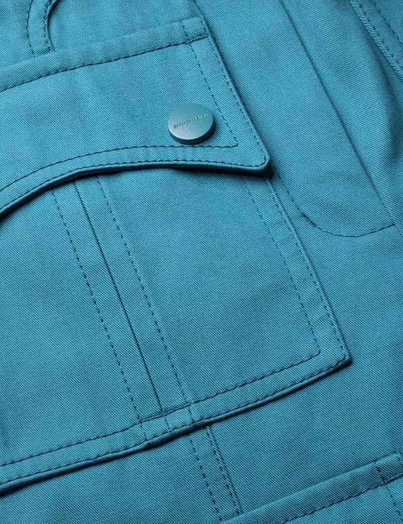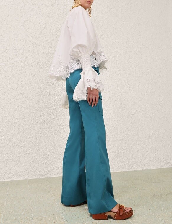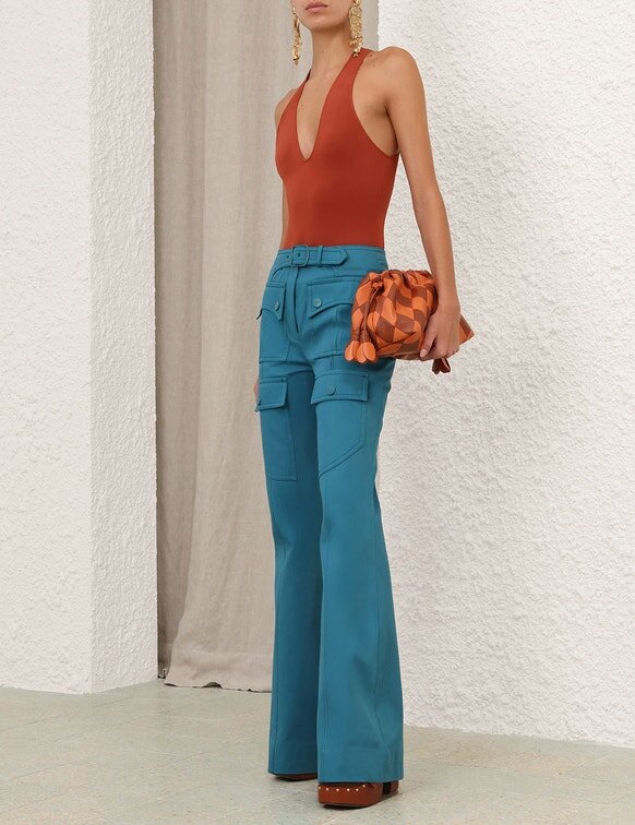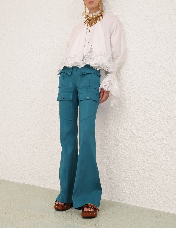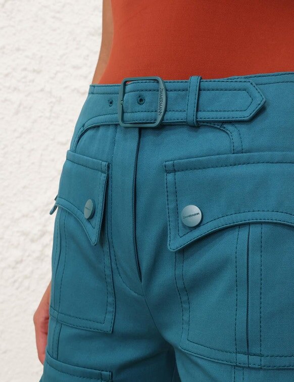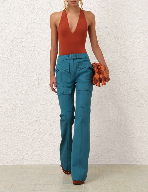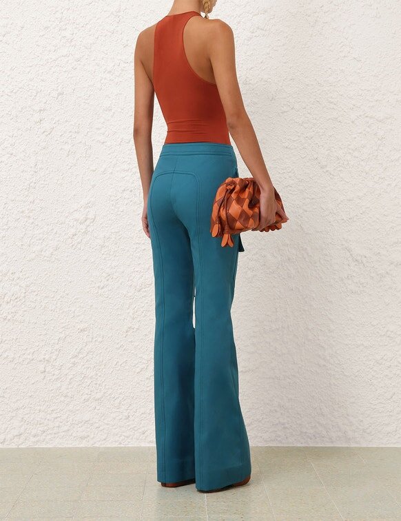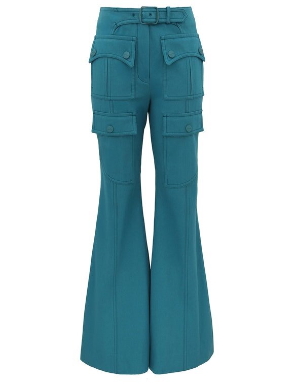 The Luna Drill Flare Pant in Teal from Our Spring 2026 Collection, Kindred Spirit. A Cotton Full-Length Pant Featuring a High-Rise Waistband with a Belt Detailing and Front Flap Pockets with Snap Closures.