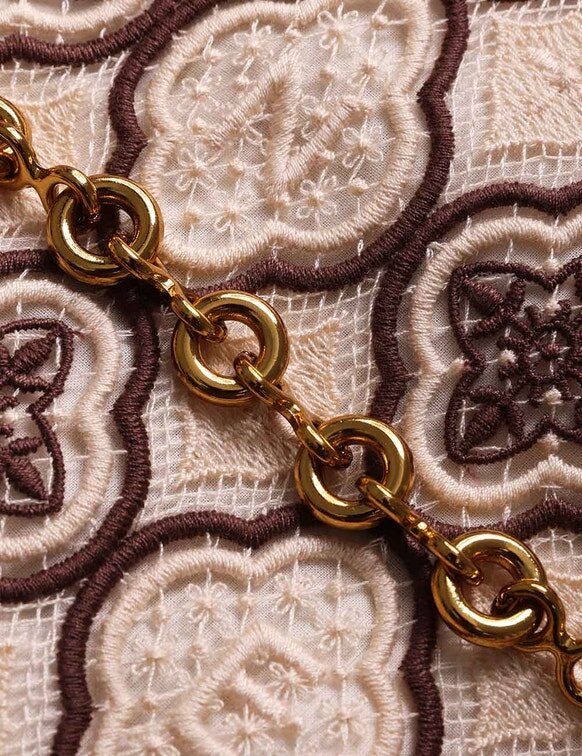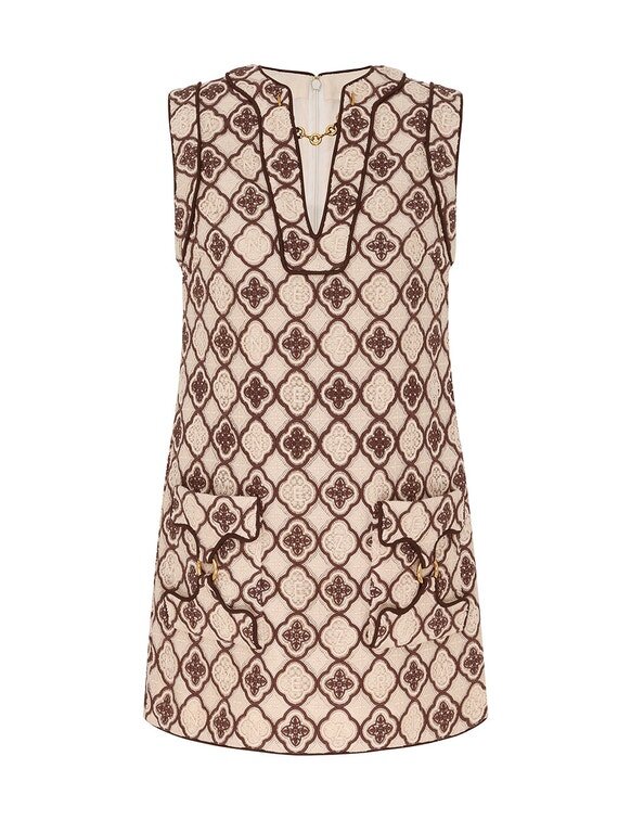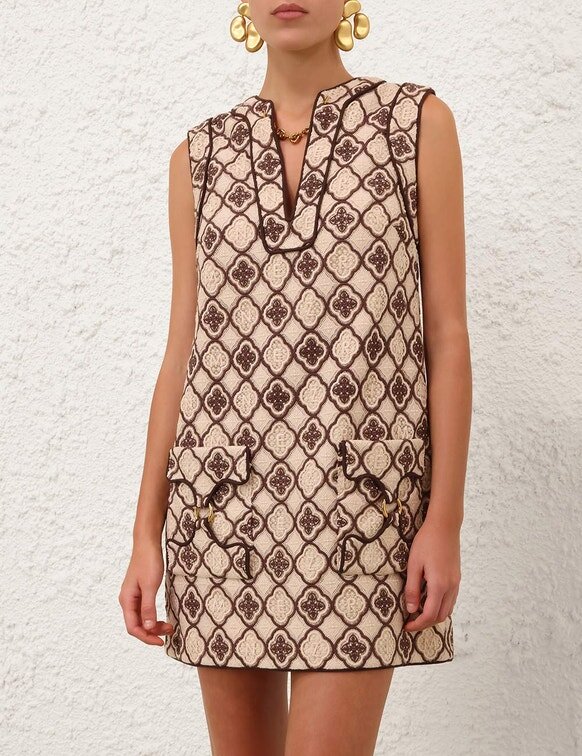 The Luna Guipure Shift Dress in Chocolate Cream from Our Spring 2026 Collection, Kindred Spirit. A Tunic Style Mini Dress Featuring a Plunging V-Neckline with Gold Chain Detailing, Centre Back Zip Closure, Finished with Piped Trim and Embroidery Throughou