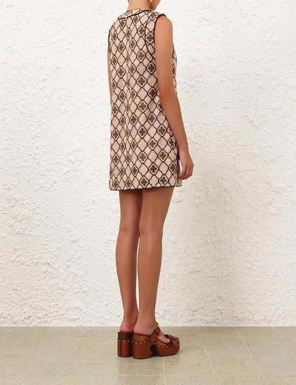 The Luna Guipure Shift Dress in Chocolate Cream from Our Spring 2026 Collection, Kindred Spirit. A Tunic Style Mini Dress Featuring a Plunging V-Neckline with Gold Chain Detailing, Centre Back Zip Closure, Finished with Piped Trim and Embroidery Throughout.
