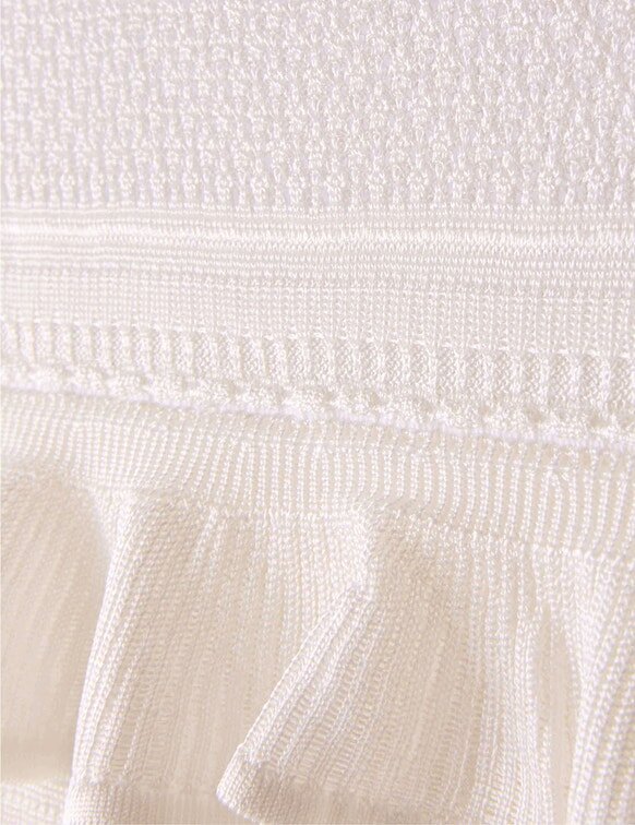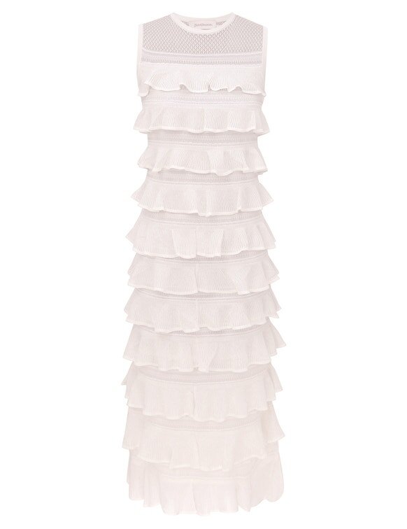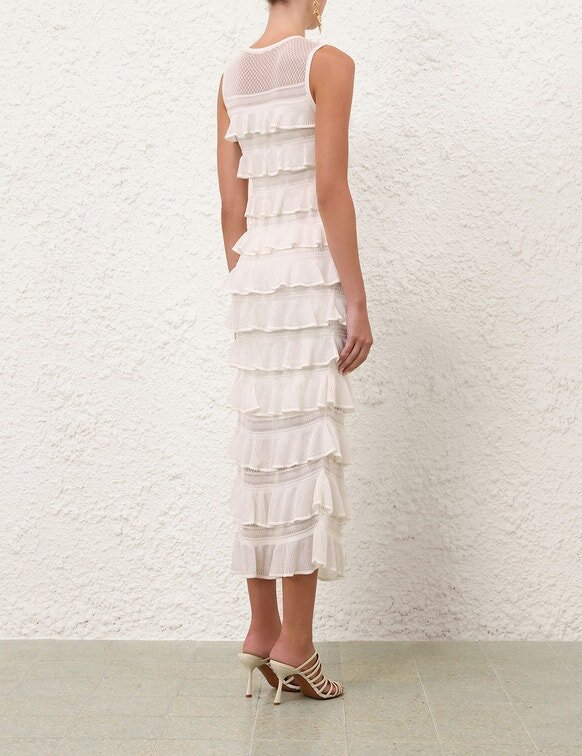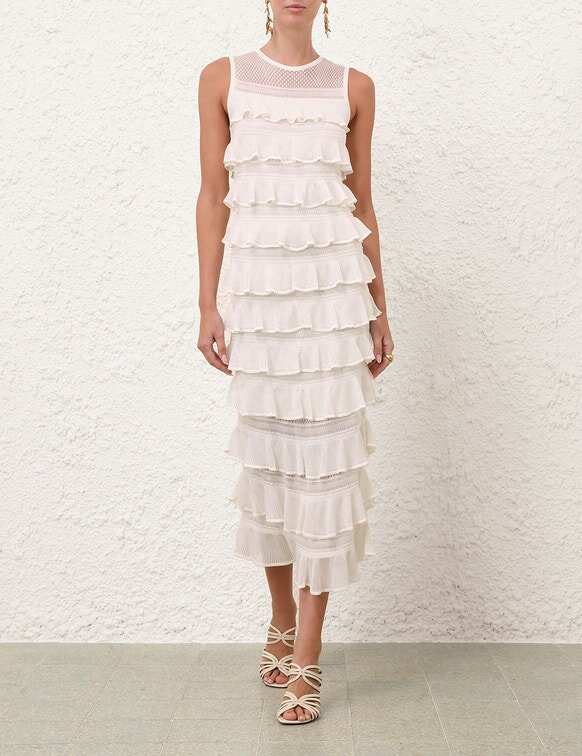 The Luna Lace Frill Midi Dress in Ivory from Our Spring 2026 Collection, Kindred Spirit. A Knit Midi Dress Featuring Square Mesh Panelling and Cascading Frills Throughout.