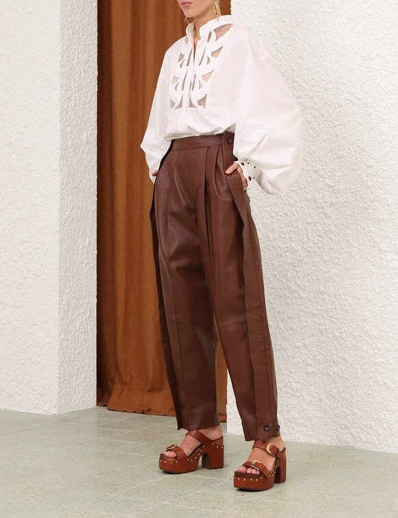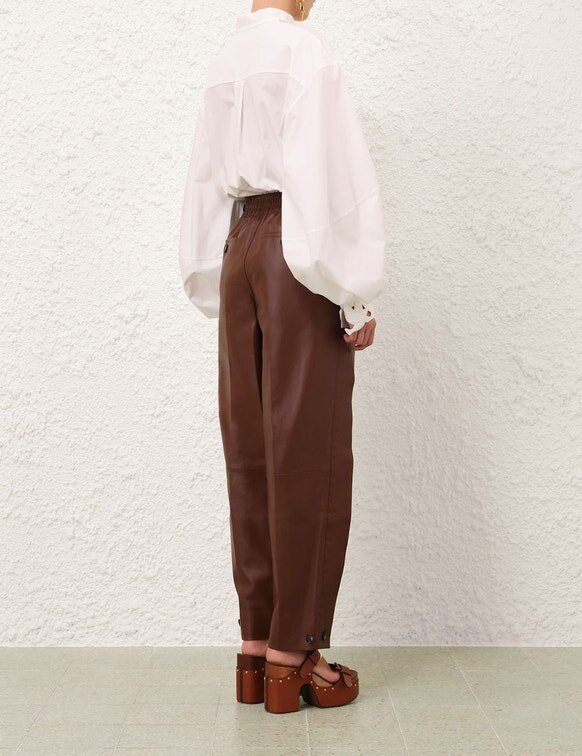 The Luna Leather Barrel Pant in Radical Brown from Our Spring 2026 Collection, Kindred Spirit. A Full-Length Leather Pant Featuring a Shirred Mid-Rise Waistband, Back Welt Pockets and Pintucks Through the Front and Back Legs.