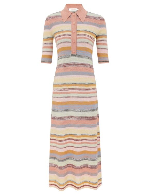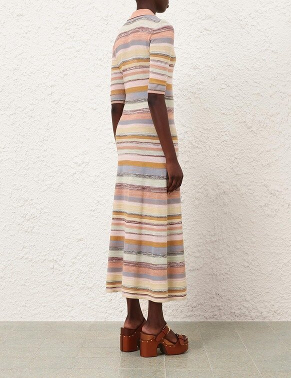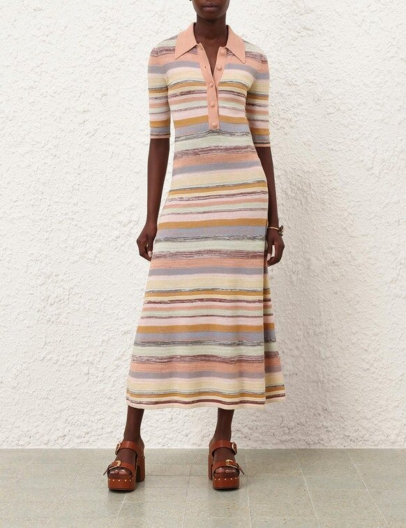 The Luna Mouline Polo Midi Dress in Multi Stripe from Our Spring 2026 Collection, Kindred Spirit. A Cotton-Linen Midi Dress Featuring a Classic Collar, Three-Quarter Length Sleeves, Finished with Centre Front Buttons and Relaxed Pleated Skirt.