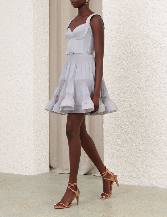 Style the Luna Ruffle Midi Dress with a Flat Sandal and Gold Jewellery for a Warm Weather Escape.Wear This Style with the Zimmermann Aura Mule Sandal 85, Bloom Earrings and Bloom Band Ring by ZimmermannSize & Care