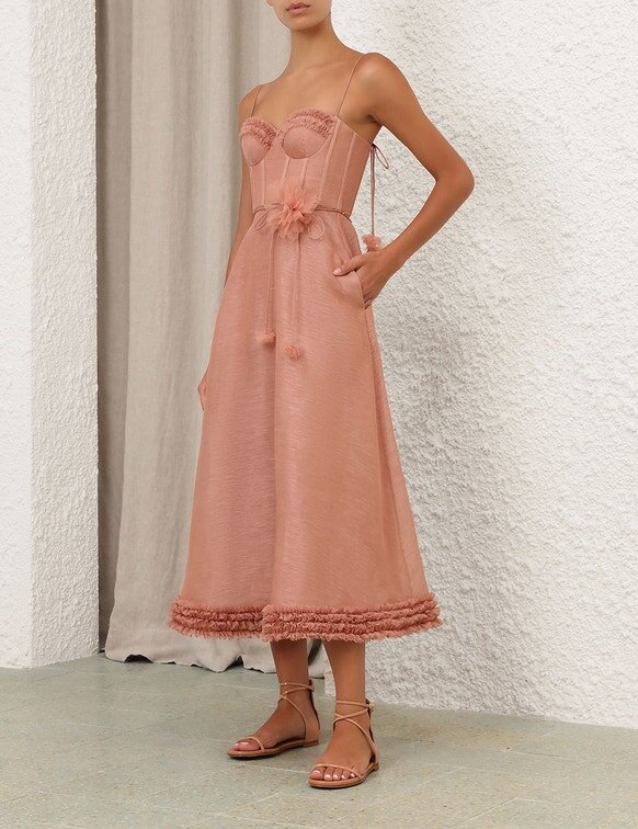 The Luna Ruffle Midi Dress in Peony from Our Spring 2026 Collection, Kindred Spirit. A Silk-Linen Blend Midi Dress Featuring a Sweetheart Neckline, Fitted Bodice, Rouleau Self-Tie Straps, Finished with a Full Flare Skirt and Soft Fluff Trim.
