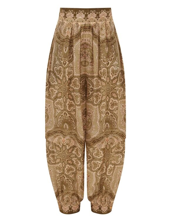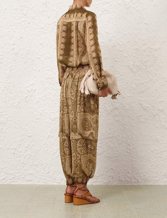 The Luna Satin Harem Pant in Olive Perla Paisley from Our Spring 2026 Collection, Kindred Spirit. A Silk Pant Featuring a Fixed Waistband, All-Over Gathering, and Fitted Cuffs.
