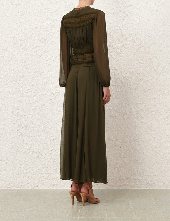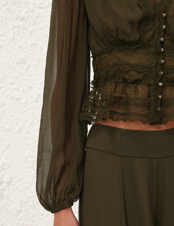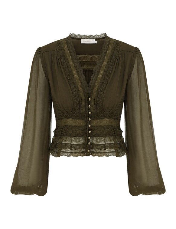 The Luna V Neck Blouse in Moss from Our Spring 2026 Collection, Kindred Spirit. A Long Sleeve Blouse Featuring a Plunging V-Neckline, Frills Around the Waist and Blouson Sleeves with Elasticated Cuffs.