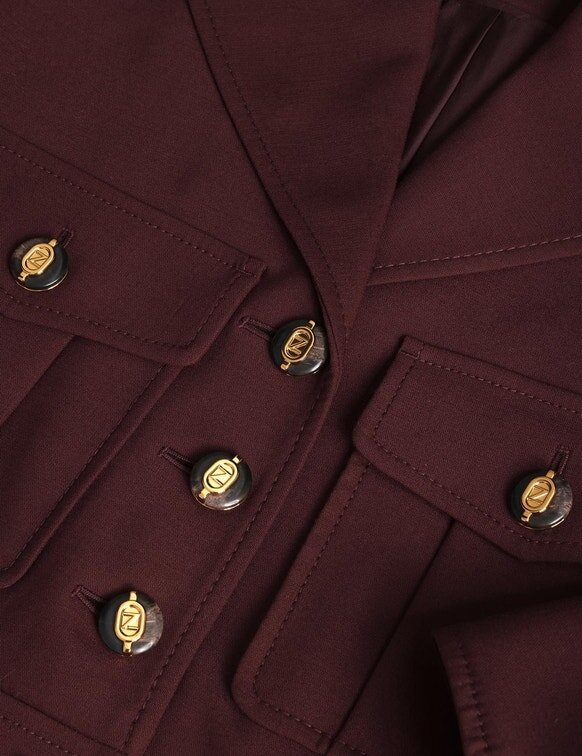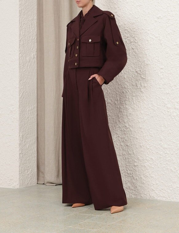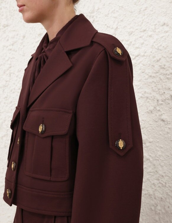 The Luna Wool Cargo Jacket in Mahogany from Our Spring 2026 Collection, Kindred Spirit. A Wool Jacket Featuring a Classic Collar, Chest Pockets, Finished with Gold Button Detailing and Topstitching Throughout.