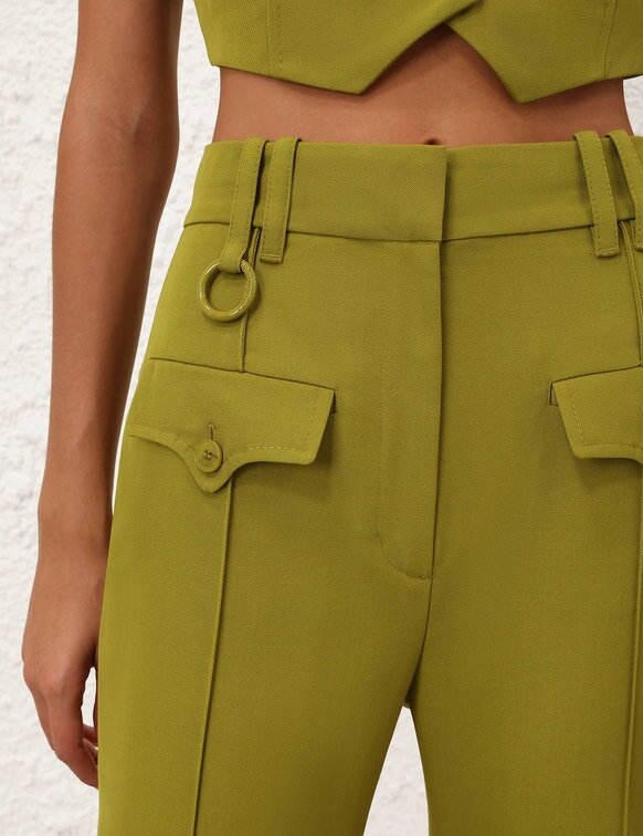 The Luna Wool Flare Pant in Pistachio from Our Spring 2026 Collection, Kindred Spirit. A Flare Wool Pant Featuring a Fixed High Waistband, Centre Front Pintucks and Back Welt Pockets.