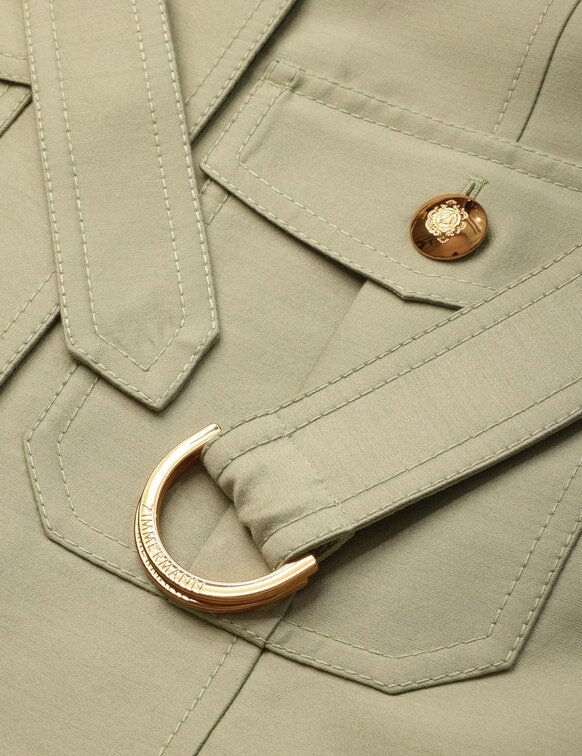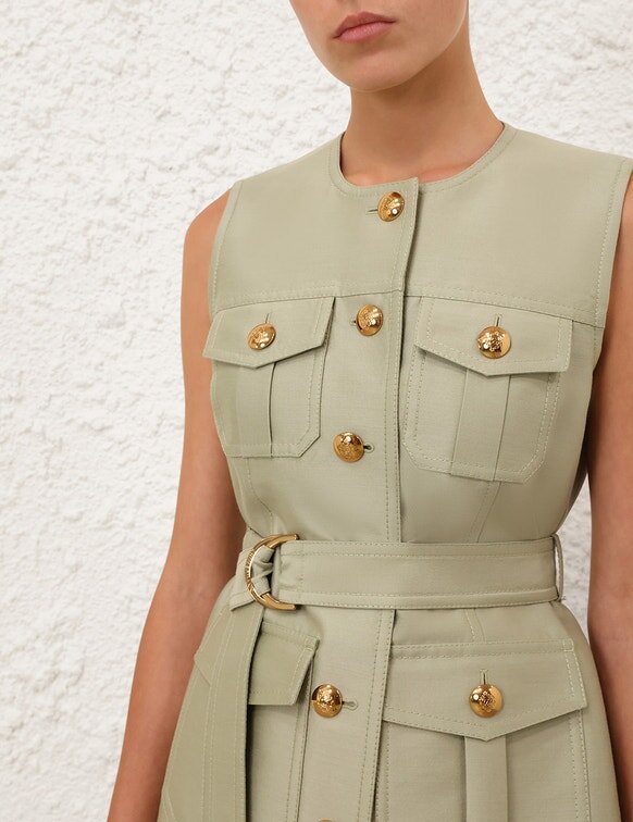 The Luna Wool Silk Utility Vest in Palm from Our Spring 2026 Collection, Kindred Spirit. A Silk-Wool Vest Featuring a High Neckline, Front Patch Pockets, Gold Button Detailing Throughout, Finished with a Removable Waist Belt.