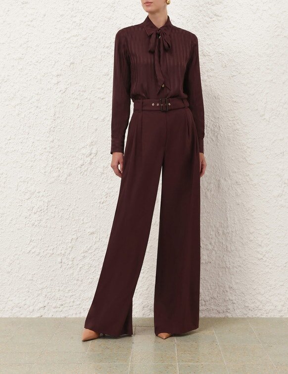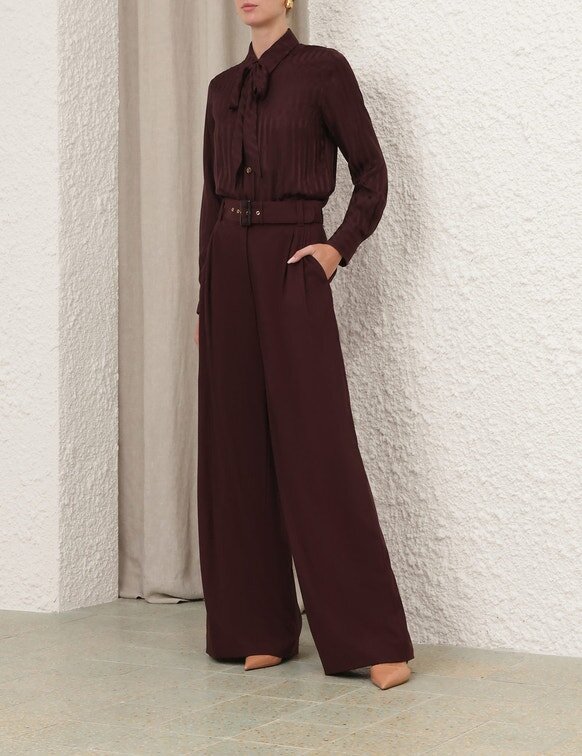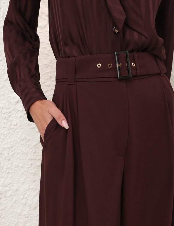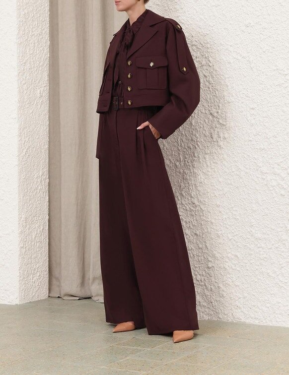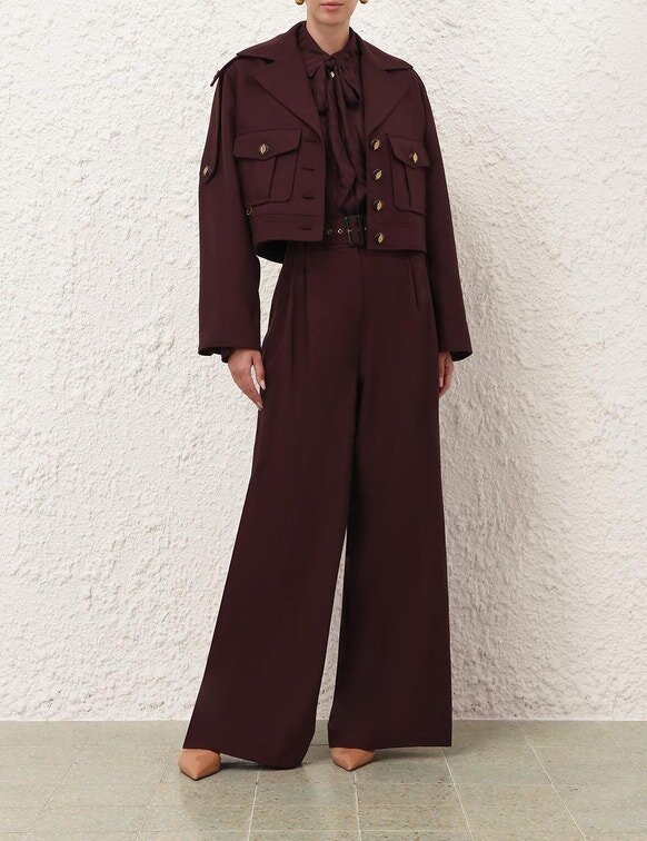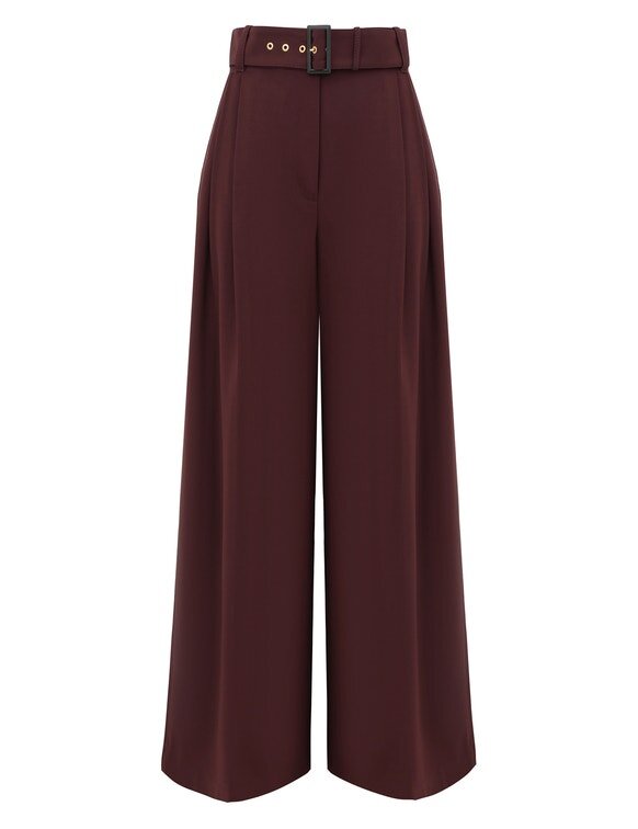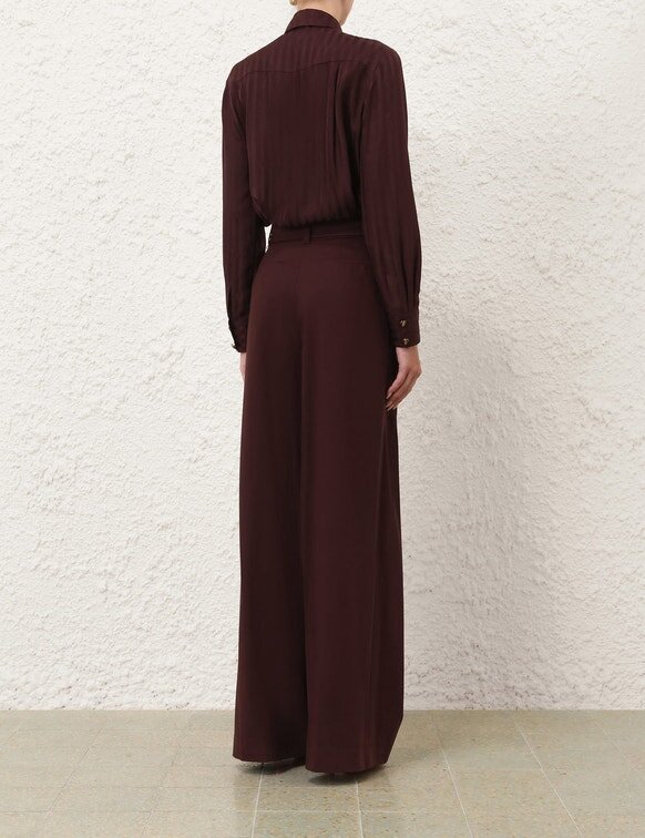 The Luna Wool Tailored Pant in Mahogany from Our Spring 2026 Collection, Kindred Spirit. A Wool Pant Featuring a Fixed High Waistband, Centre Front Buttons, Invisible Fly Closure, Finished with Pintucks Through the Front Legs and Back Welt Pockets.
