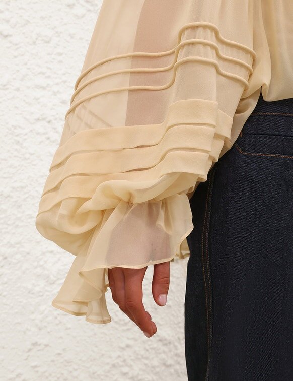 The Rebellion Corded Blouse in Cream from Our Cruise 2026 Collection, Twisted Romance. A Silk Blouse Featuring Long Blouson Sleeves with Elasticated Cuffs, a Frill Trim on Collar and Beaded Buttons Down the Centre Front.