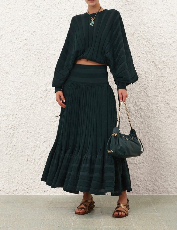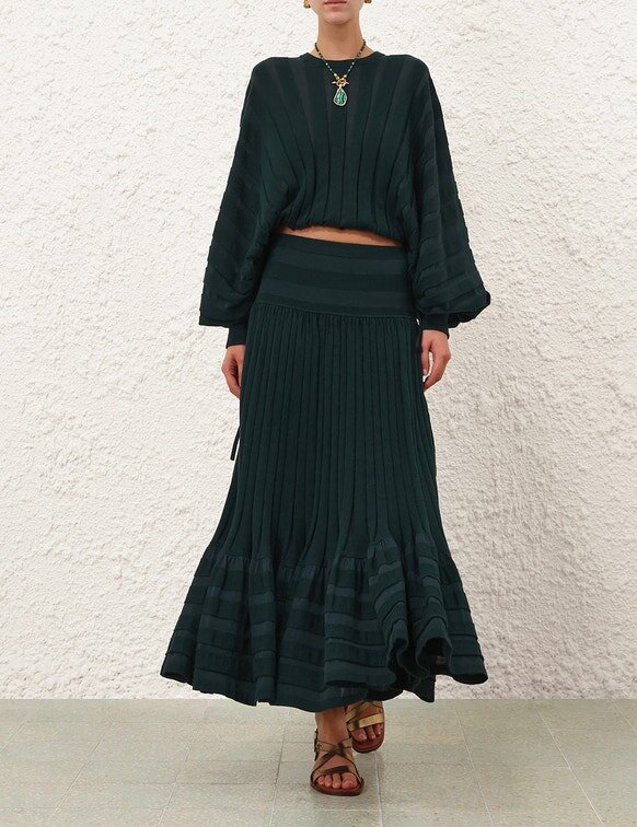 The Rebellion Gathered Midi Skirt in Teal from Our Cruise 2026 Collection, Twisted Romance. A Midi-Length Knit Skirt Featuring an Elasticated Waistband, Pleats Throughout and a Frilled Hem.