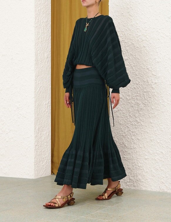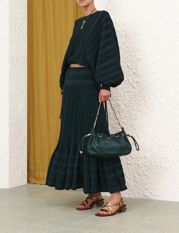 Style the Rebellion Gathered Midi Skirt with the Rebellion Drawn Sweater, Flat Sandals and Clutch Bag for a Long Lunch with Friends.Wear This Style with the Ore Pendant, Trove Sandal 40, Wisp Mini Hoops and Rebellion Drawn Sweater by ZimmermannSize & Care