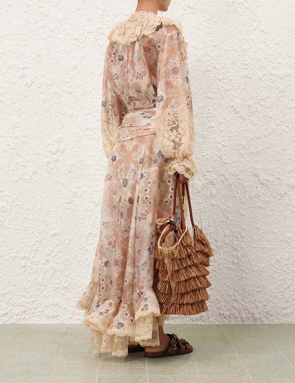 The Rebellion Lace Maxi Skirt Appeared in Look 19 of the Cruise 2026 Runway. Style the Skirt with the Rebellion Lace-Up Blouse, Solara Choker, Solara Pendant, Printed Silk Square 70, Orla Slide Sandal, and Goldentime Medium Fringe Tote to Complete the Runway Look.Wear This Style with the Goldentime Medium Fringe Tote, Orla Slide Sandal, Solara Earrings, Solara Crocodile Necklace and Rebellion Lace-Up Blouse by ZimmermannSize & Care