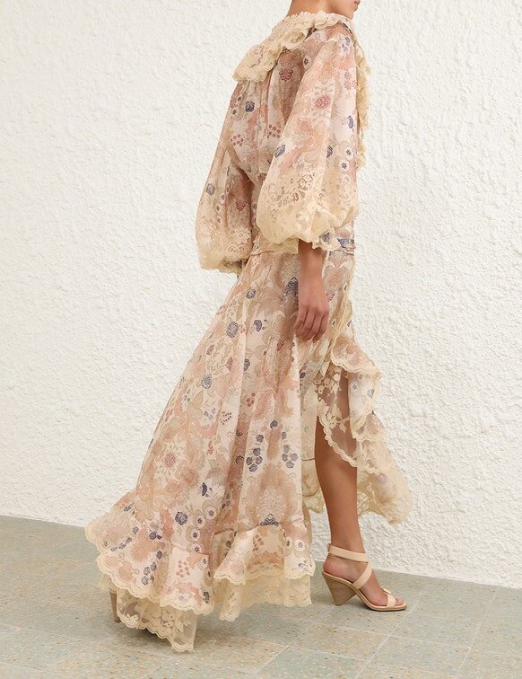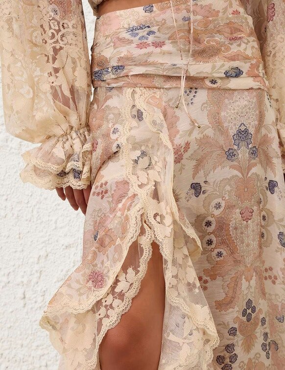 The Rebellion Lace Maxi Skirt in Cream Floral from Our Cruise 2026 Collection, Twisted Romance. A Silk-Linen Maxi Skirt Featuring a Fitted, Draped Waist, Cascading Ruffles, and a Scalloped Hem, Finished with an Invisible Zip Closure at the Left Side.