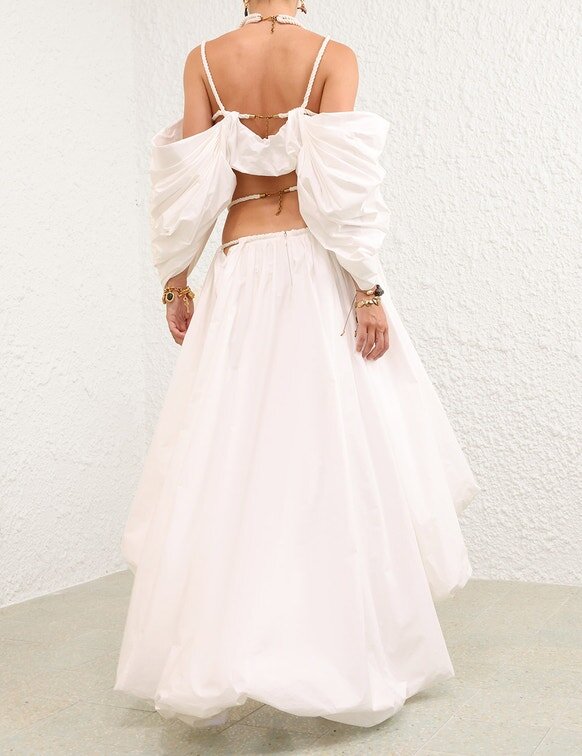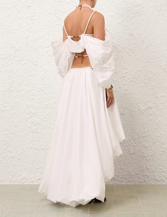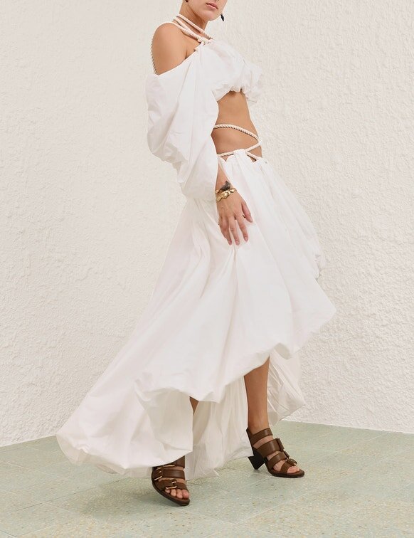 The Rebellion Mariners Midi Skirt in Ivory from Our Cruise 2026 Collection, Twisted Romance. A Cotton Midi Skirt Featuring a Threaded Rope Waist, Asymmetric High-Low Hem, and Ruched Detailing Throughout.