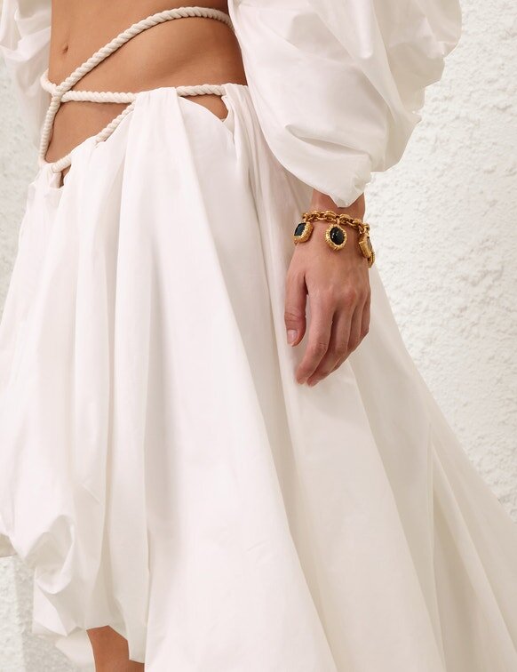 The Rebellion Mariners Midi Skirt Appeared in Look 3 of the Cruise 2026 Runway. Style the Skirt with the Rebellion Mariners Blouse, Solara Bracelet, Wisp Bracelet, and Orla Buckle Sandal 85 to Complete the Runway Look.Size & Care