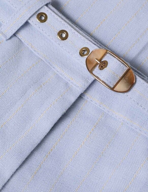The Rebellion Pinstripe Pant in Sky Stripe from Our Cruise 2026 Collection, Twisted Romance. A High-Waisted Linen Pant Featuring a Fixed Waistband with Removable Belt, Pintucks and Back Welt Pockets.
