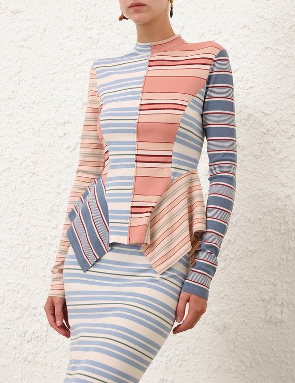 The Rebellion Spliced Stripe Top in Multi Stripe from Our Cruise 2026 Collection, Twisted Romance. A Knit Top Featuring a Stand Collar, Spliced Pattern, Long Fitted Sleeves, Finished with Asymmetric Frill Detailing.
