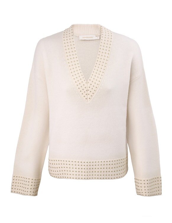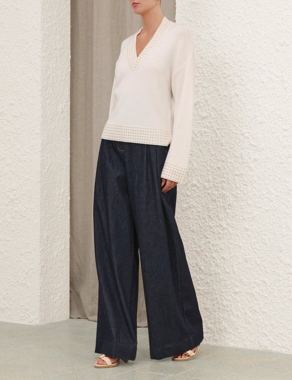 Style the Rebellion Wave Sweater with the Rebellion Denim Tailored Pant and Flat Sandals for a Long Lunch with Friends.Wear This Style with the Rebellion Denim Tailored Pant and Trove Sandal 40 by ZimmermannSize & Care