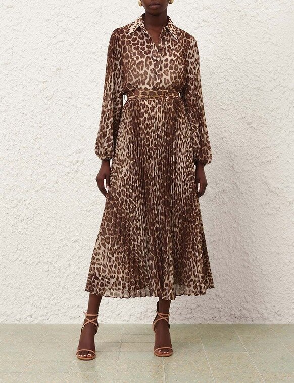 The Sunray Pleated Skirt in Leopard from Our Spring 2026 Collection, Kindred Spirit. A Pleated Midi Skirt Featuring a Mid-Rise Waist with Belt and Invisible Zip Closure.