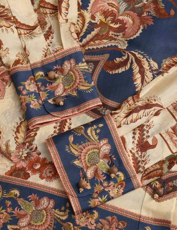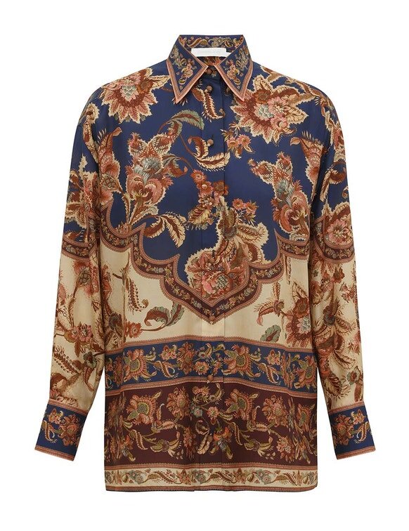 The Aster Relaxed Shirt in Navy Jacobean from Our Summer Swim 2026 Collection. A Relaxed Silk Shirt Featuring Long Sleeves, a Classic Collar and Buttons Down the Centre Front and on the Cuffs.