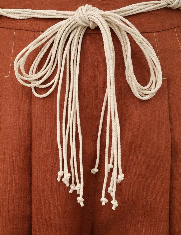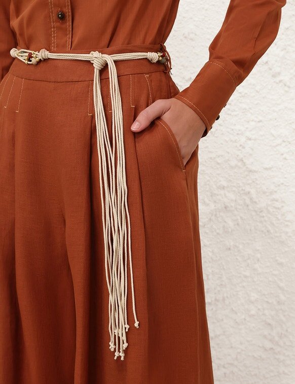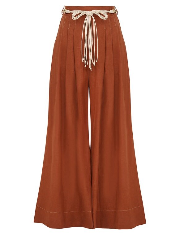 The Awaken Wide Leg Pant in Cinnamon from Our Resort Swim 2026 Collection. A Linen Pant Featuring a Mid-Rise Waistband, Pintucks Through the Centre Front Legs, Finished with a Flared Silhouette.
