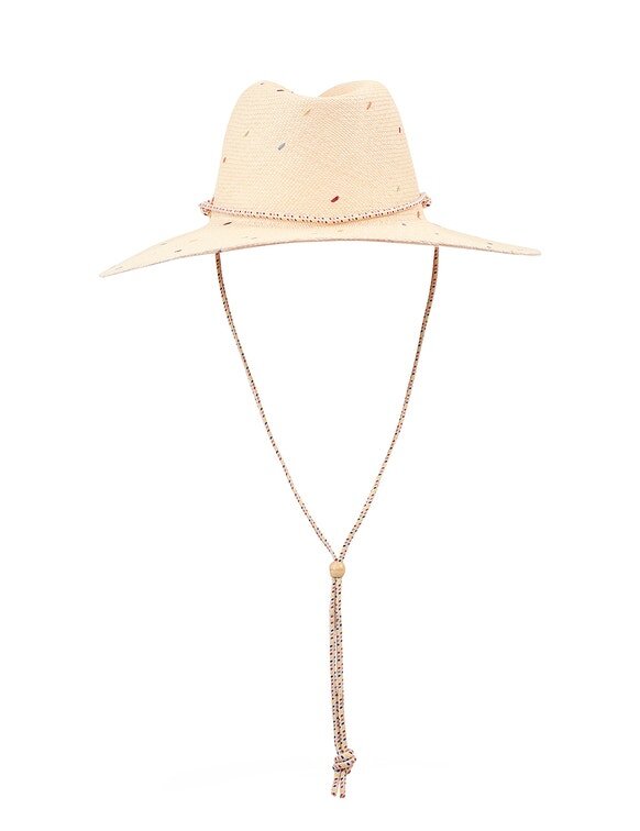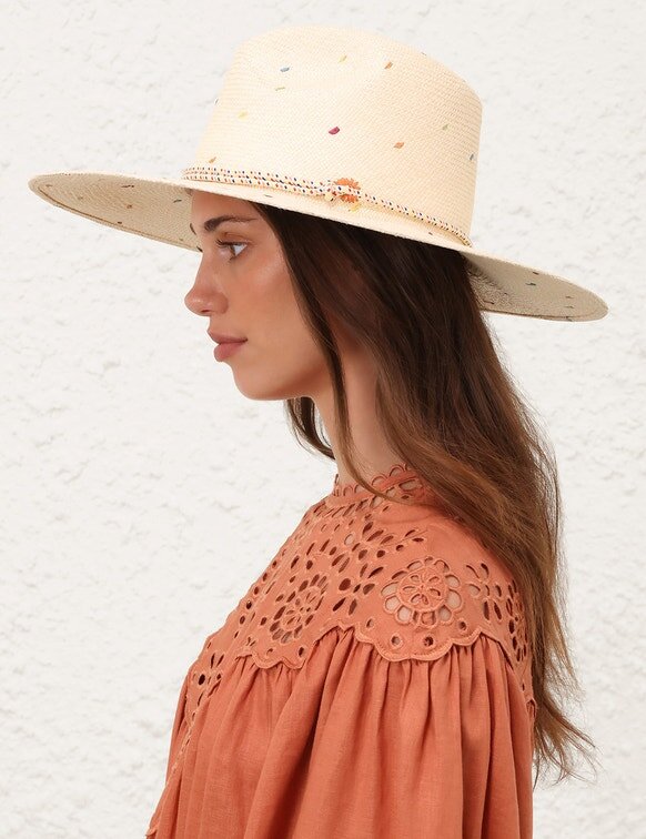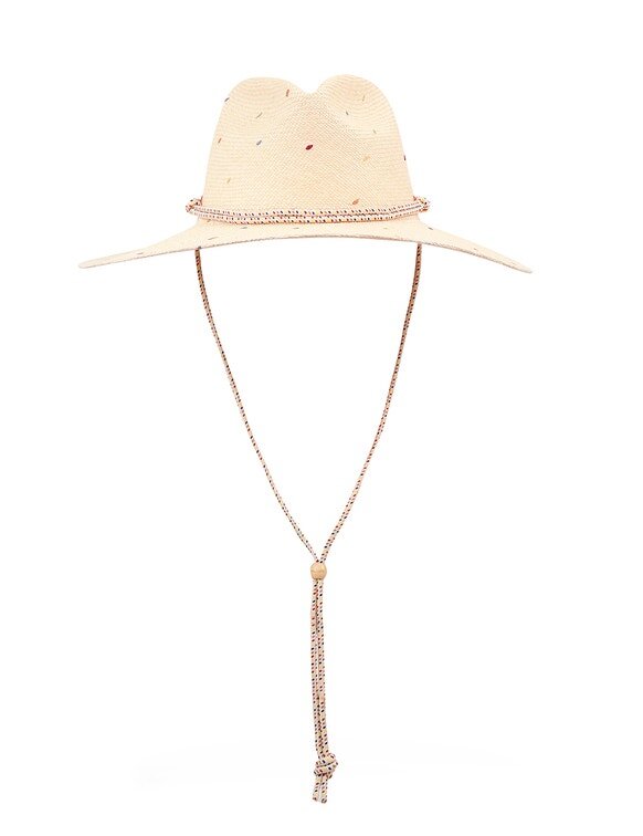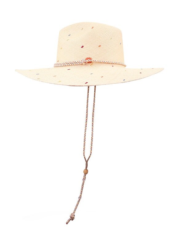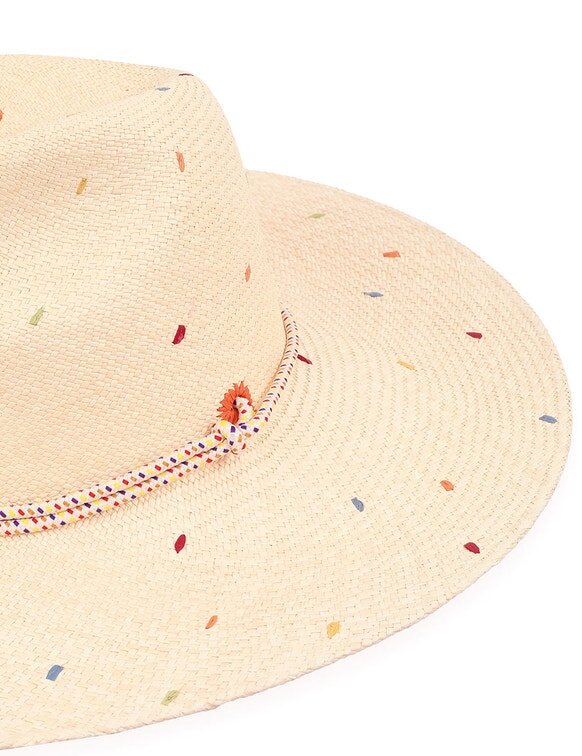 The Embroidered Panama in Natural/Multi from Our Resort Swim 2026 Collection. A Straw Sunhat Featuring a Long Brim and Removable Rope Tie.