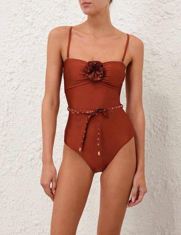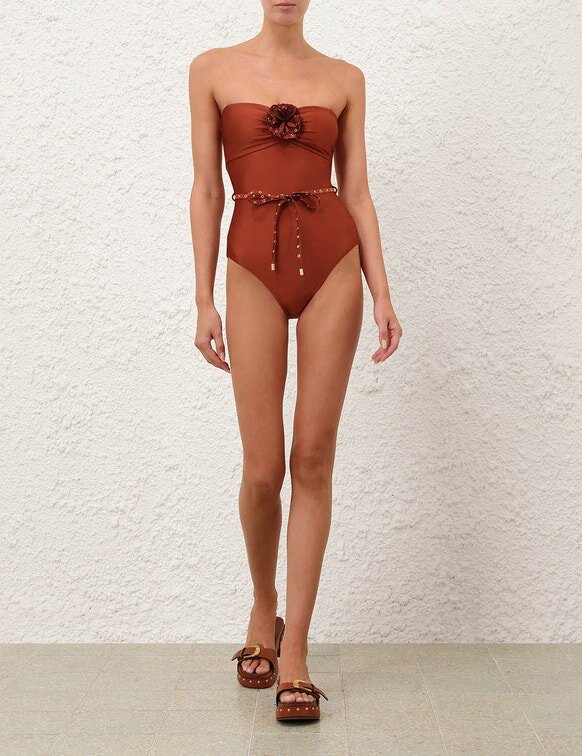 The Indra Studded Flower 1Pc in Tan from Our Summer Swim 2026 Collection. A Shiny Bandeau One Piece Featuring a Removable Tie Belt, Flower Detail at the Bust and Medium Bottom Coverage.