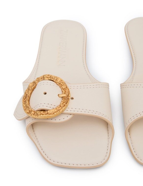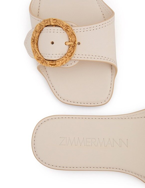 The Solena Slide in Milk from Our Summer Swim 2026 Collection. A Leather Slide Sandal Featuring a Statement Buckle Hardware Design.