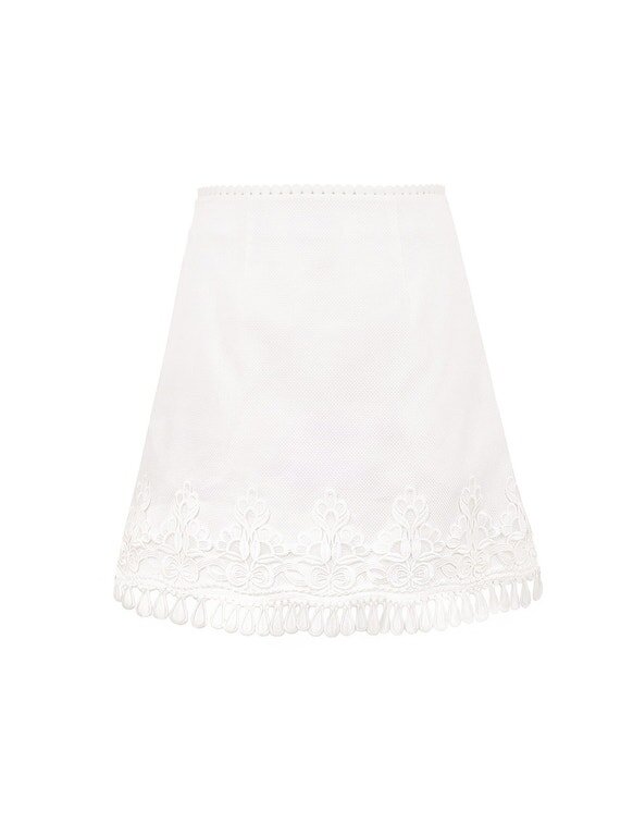 The Stardust Mini Skirt in Ivory from Our Resort Swim 2026 Collection. A Cotton Mini Skirt Featuring an Invisible Centre Back Zip Closure, Tassel Fringe Hem and Scalloped Embroidery Throughout.