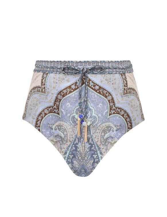 The Wanderlust High Waist Pant in Tapestry Blue Multi from Our Resort Swim 2026 Collection. A Form-Fitting High Waisted Bikini Pant Featuring Full Bottom Coverage and a Removable Rouleau Waist Belt.