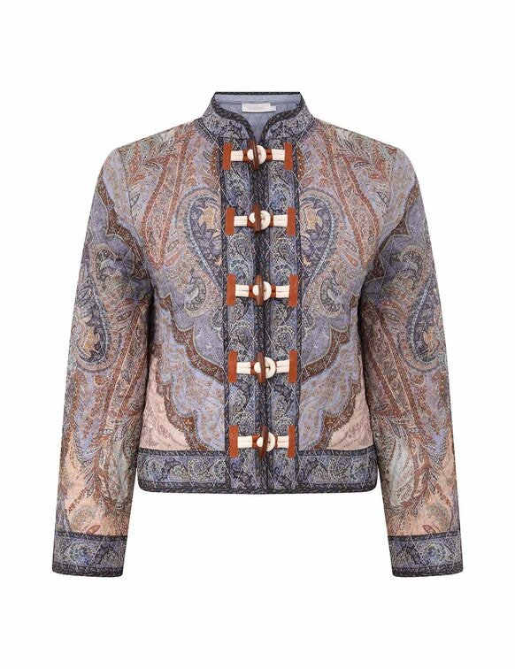 The Wanderlust Quilted Jacket in Tapestry Blue Multi from Our Resort Swim 2026 Collection. A Quilted Jacket Featuring a Mandarin Collar and Toggle Buttons Down the Centre Front.
