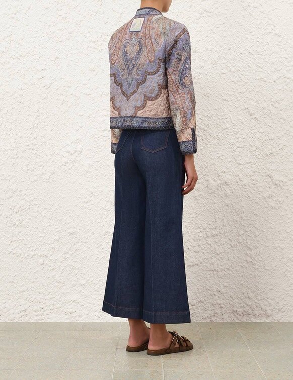 Style the Wanderlust Quilted Jacket with the Wanderlust Scallop Balconette, Awaken Denim Cropped Jean and Flat Sandal for a Relaxed Weekend Look.Wear This Style with the Orla Slide Sandal, Wanderlust Scallop Balconette, Awaken Denim Cropped Jean and Solara Necklace by ZimmermannSize & Care